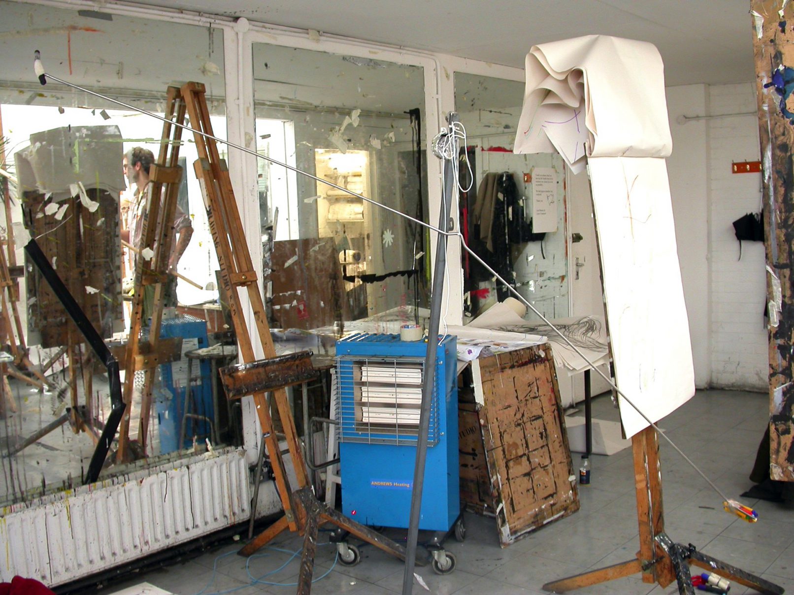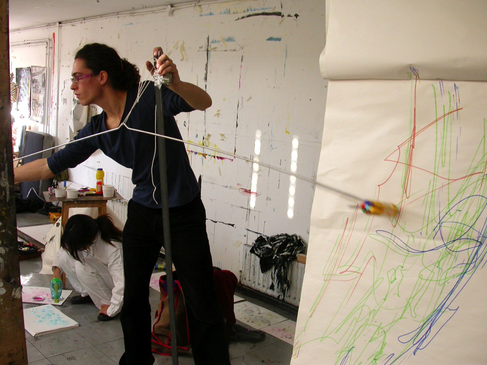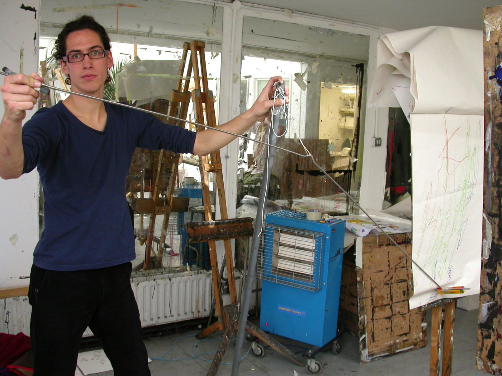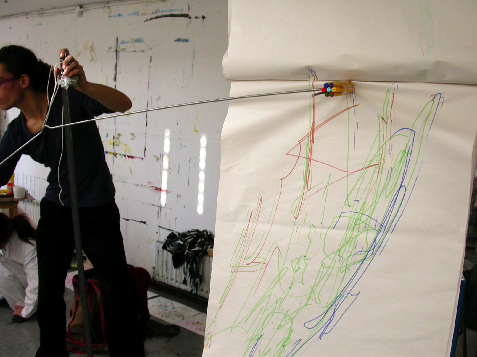 I designed a machine with which you can draw without seeing and reacting on the result of your drawing. You draw in the air. You draw with only your mind as reference on what you are drawing. The drawing system plays with your visual system of coordination and correction using your eyes. Don’t let your brain react or correct on the sort of line or visual effect you make while drawing. Now you have to imagine and remember everything you have drawn related to positions of your body or points of orientation in your environment.