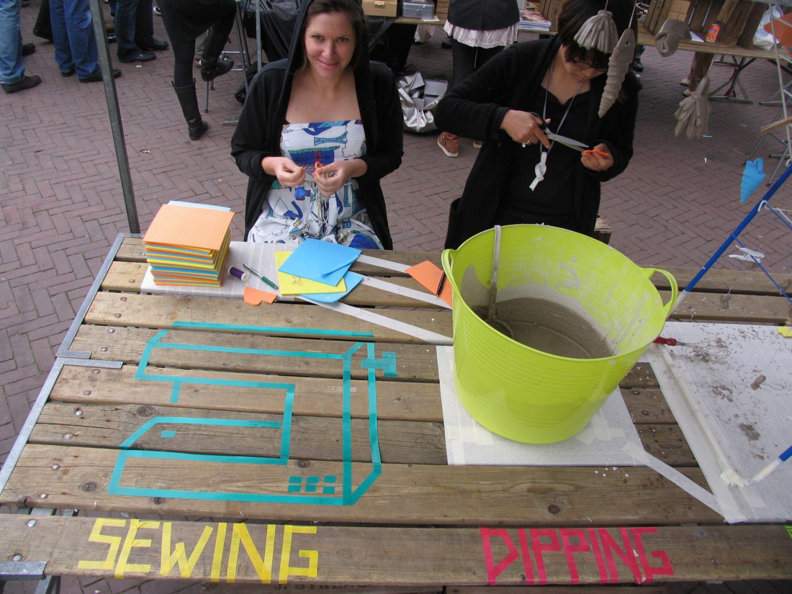 Sponge, sewing, clay, dipping, drying, firing, selling.